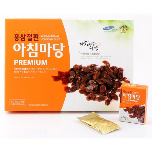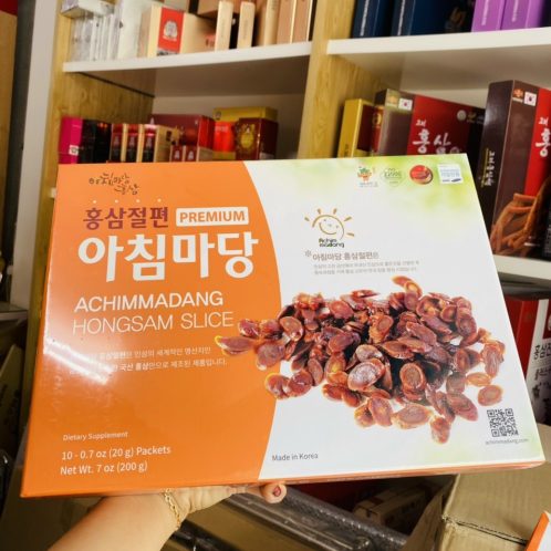 Hồng sâm Hàn Quốc thái lát tẩm mật ong Achimmadang được chế biến từ củ nhân sâm tươi Hàn Quốc 6 năm tuổi theo phương pháp hấp cách thủy, sau đó tẩm mật ong rùng nguyên chất có tác dụng tăng cường sinh lực, giảm cholesterol, tăng tuổi thọ